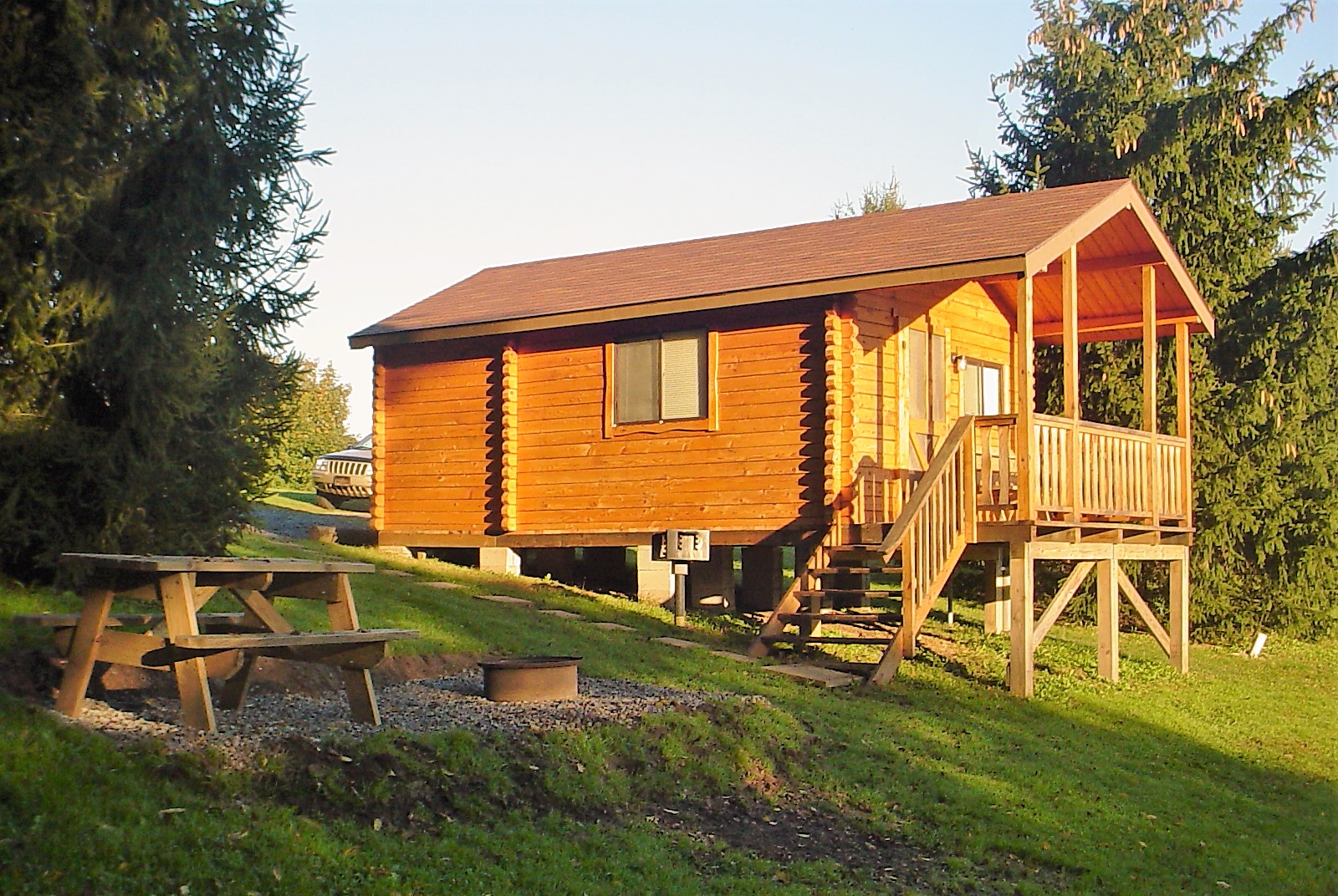 These deluxe cabins offer a hilltop getaway with a northeastern view overlooking our campground and the outlying woodlands. These cabins offer a spacious interior with separate living and sleeping space. The bedroom offers a full size bed as well as a set of single bunk beds (totaling 3 beds). There is also a fun little carpeted sleeping loft above the bedroom. With beautiful split-timber siding and wooden accents both exterior and interior these cabins are a wonderful choice for families up to six people, small groups, or a couple who just wants a few more home-like amenities. Enjoy your morning cup of coffee with a breathtaking view of the sunrise overlooking the Moraine Valley. #’s 10 (Osprey's Nest) & 11 (Falcon's Nest) on map.
